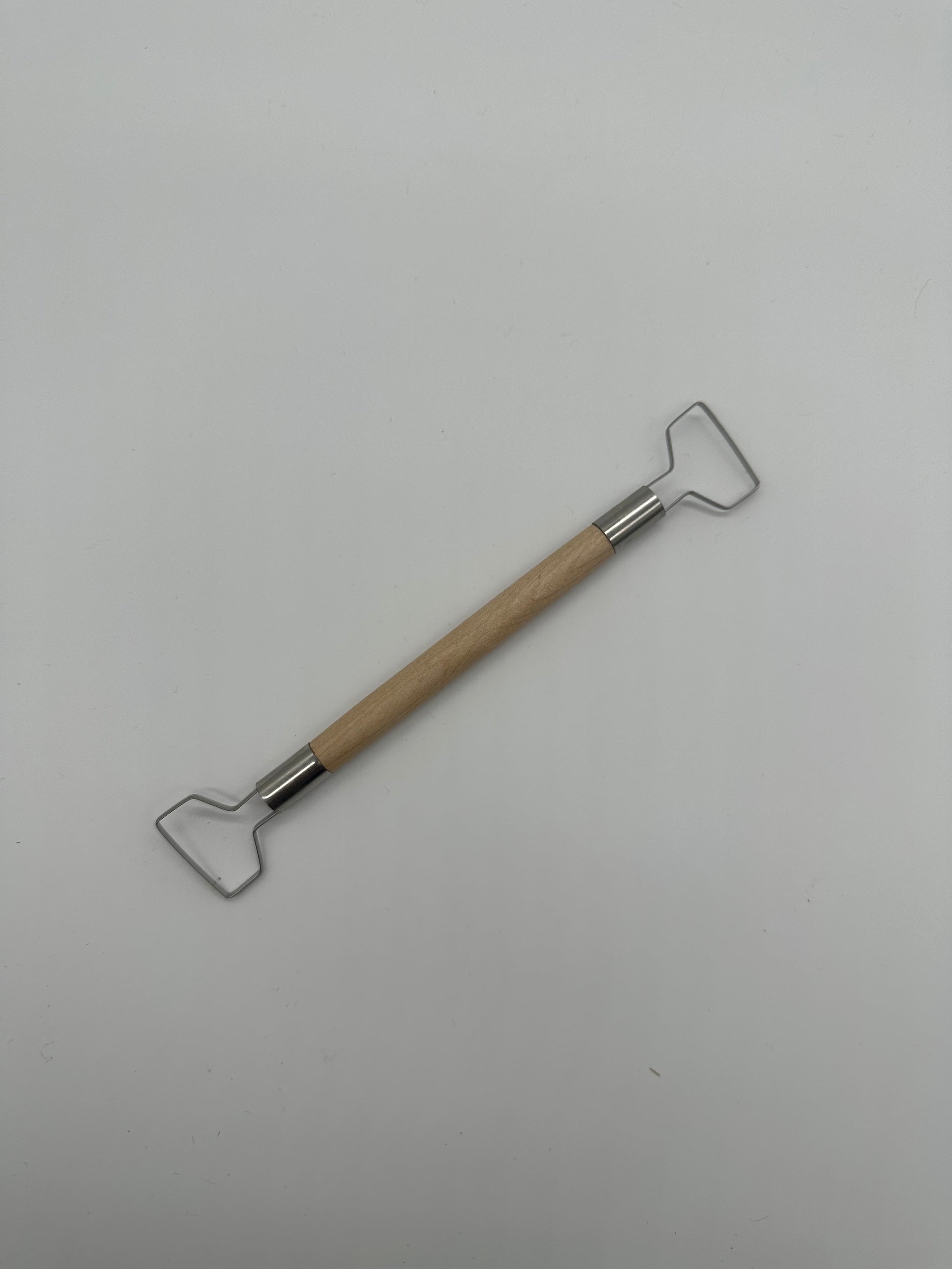 Double ended ribbon tool provided an excellent shape for trimming on the wheel or handbuilt pieces. The large square ends are sharpe and provide a large, flat surface area to trim pieces evenly. the square edges also provide and excellent angle for creating sharp, neat edges in a foot or angled, bevel edge.