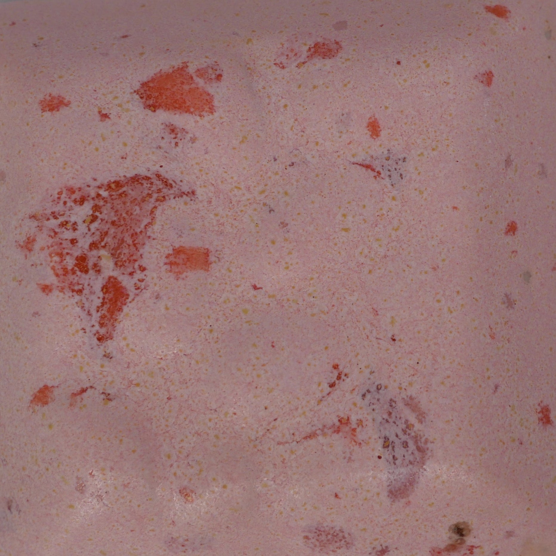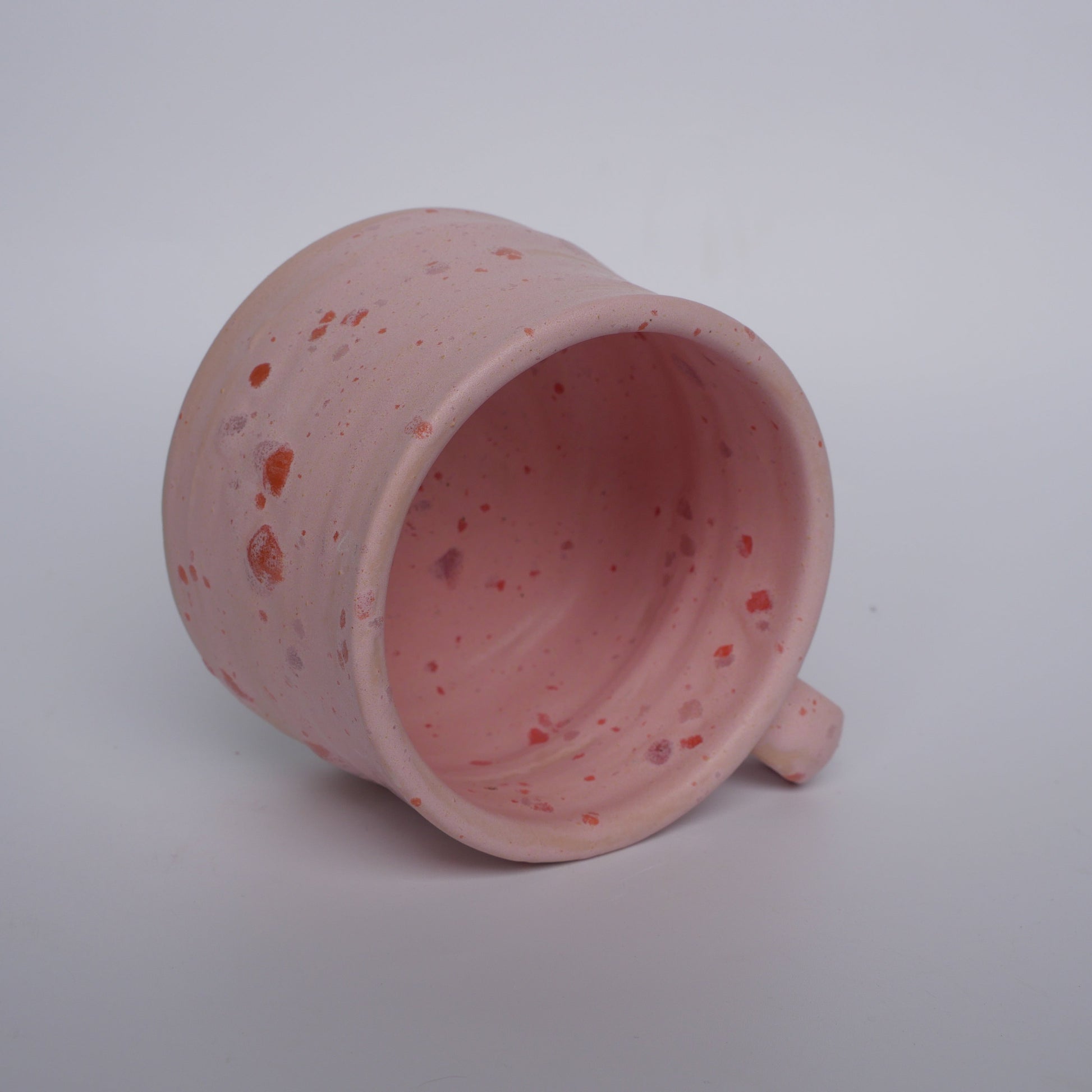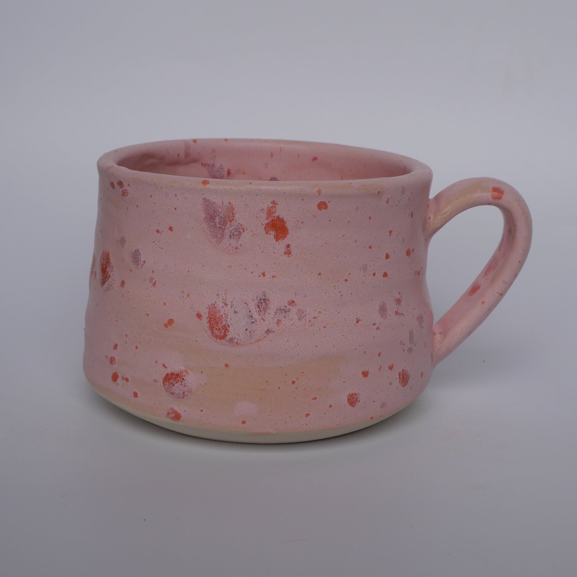 A soft, chalky pink matte glaze scattered with playful orange and muted purple fleckles. The surface has a gentle, powdery feel — calm and velvety rather than glossy — with flecks sitting like confetti through the glaze rather than floating on top.